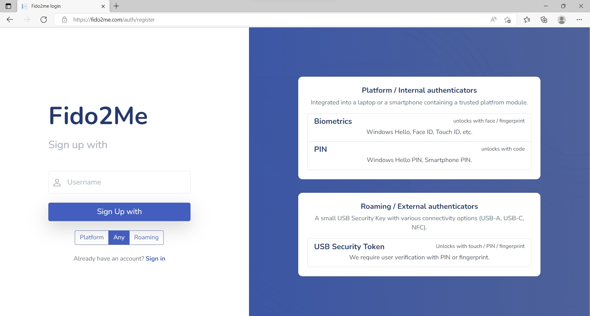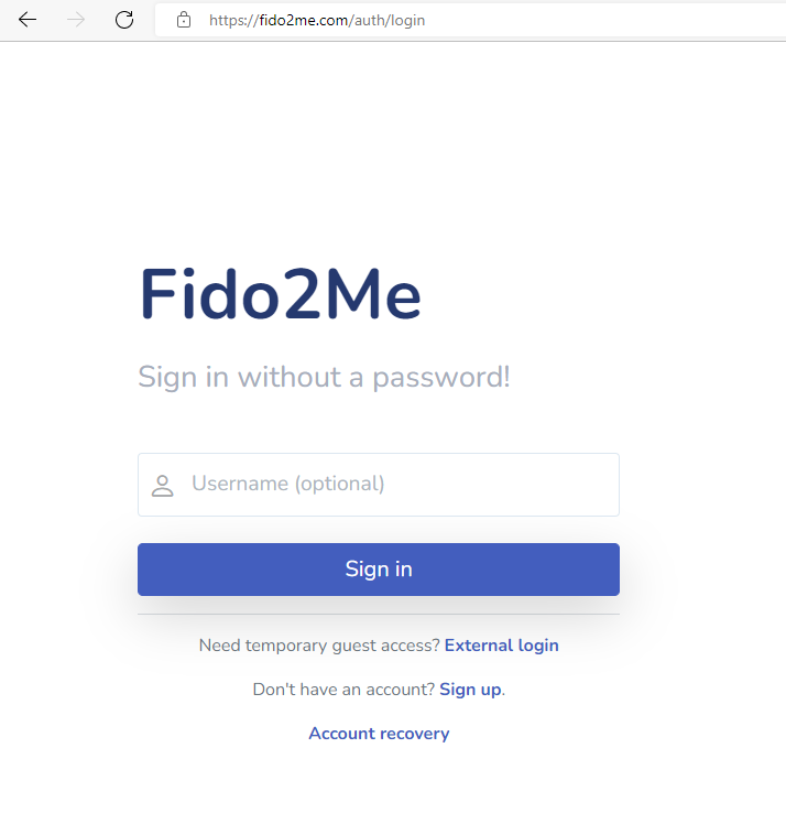 Fido2me combines both flows and makes username optional. If you know that you work with resident keys, you can immediately click the "Sign in" button and enjoy the Usernameless experience. If you are not sure, always type the "Username".