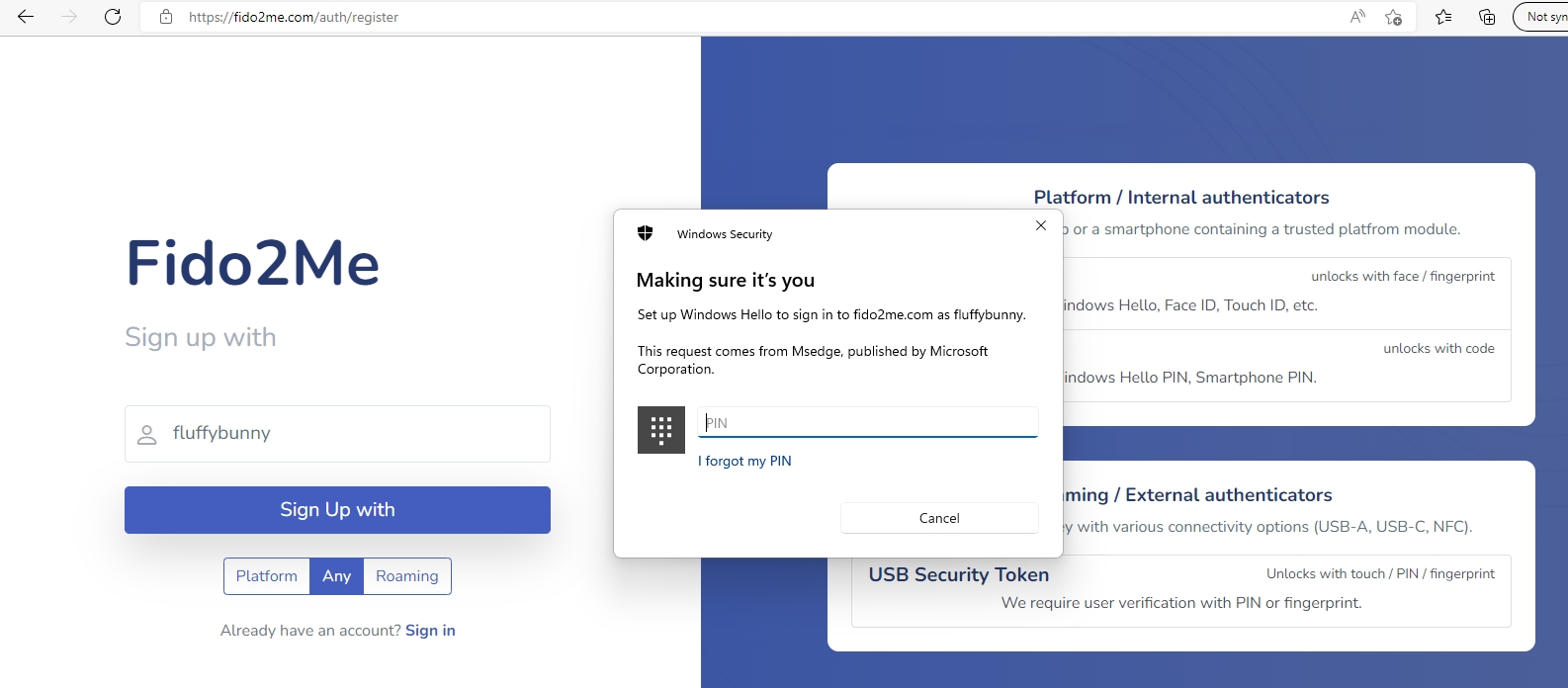 Platform authenticators are preferred options. If you didn't change a default "Any" device type selection, it will ask you to unlock your platform authenticator. In my case, unlock with a PIN (Windows Hello). Note: Windows Hello needs to be enabled with at least a single verification method, e.g. PIN.