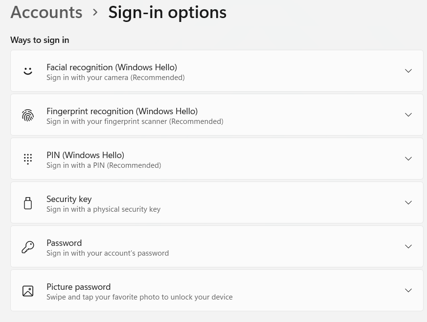 Select at least one method supported by Windows Hello, for example, PIN. If no methods are enabled, a browser handling FIDO2 request will ask to connect a security key (e.g. Yubikey).